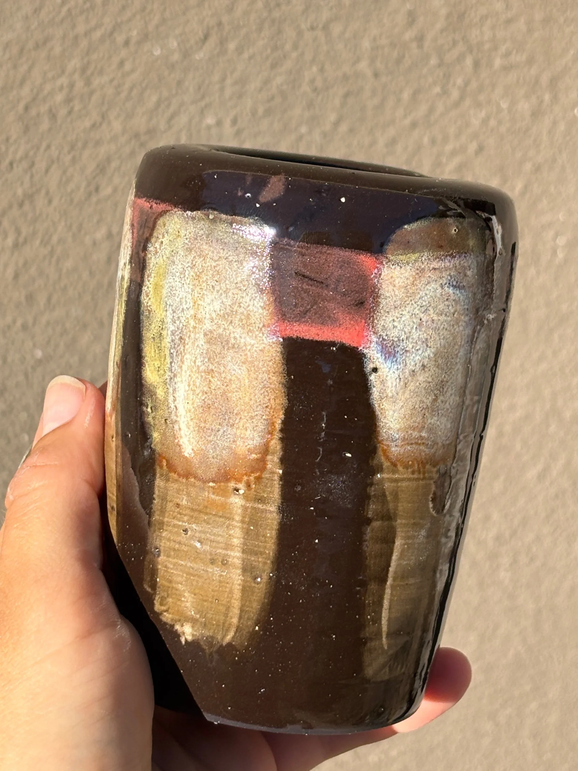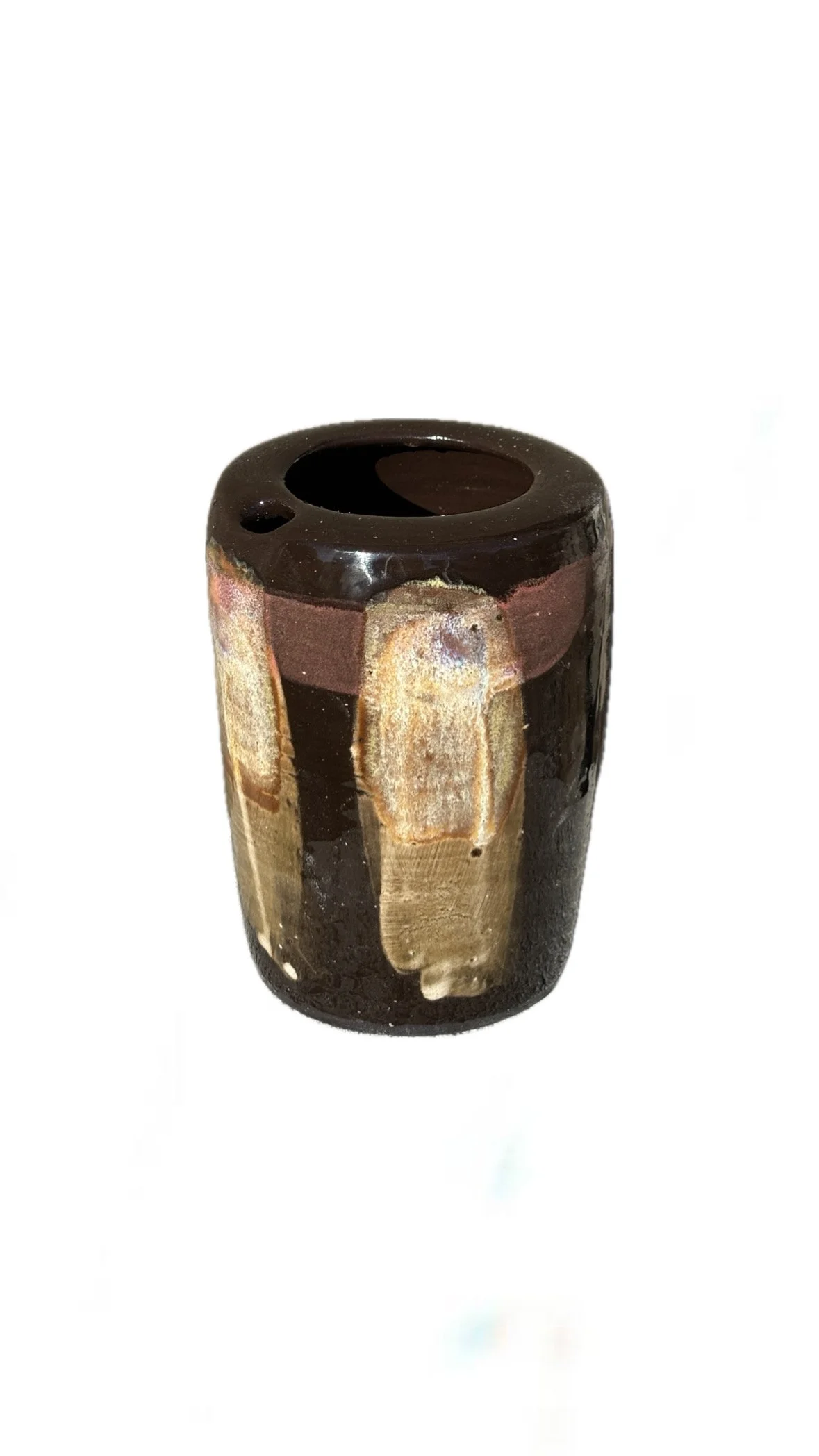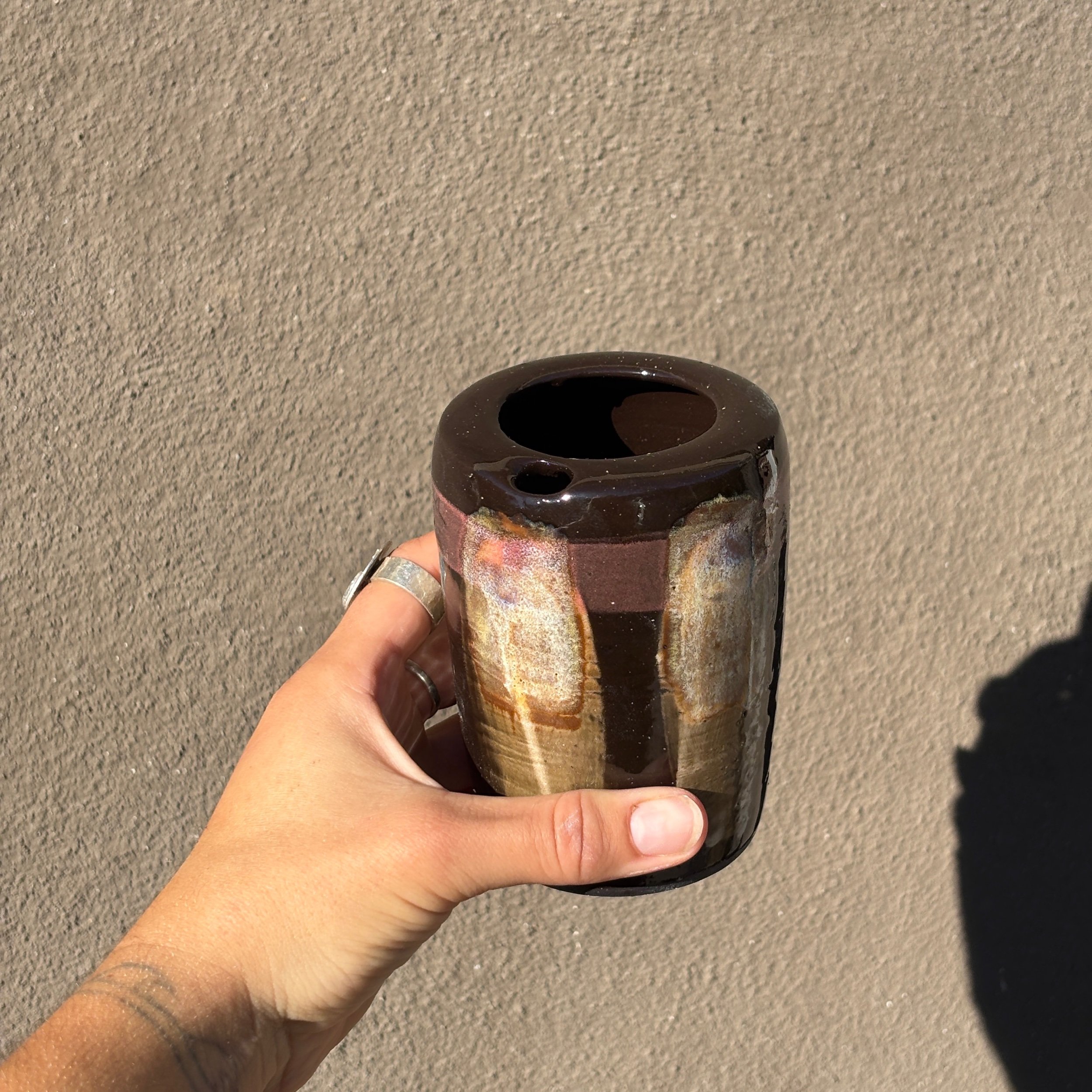 This handmade travel mug was carefully crafted and hand painted with glaze.