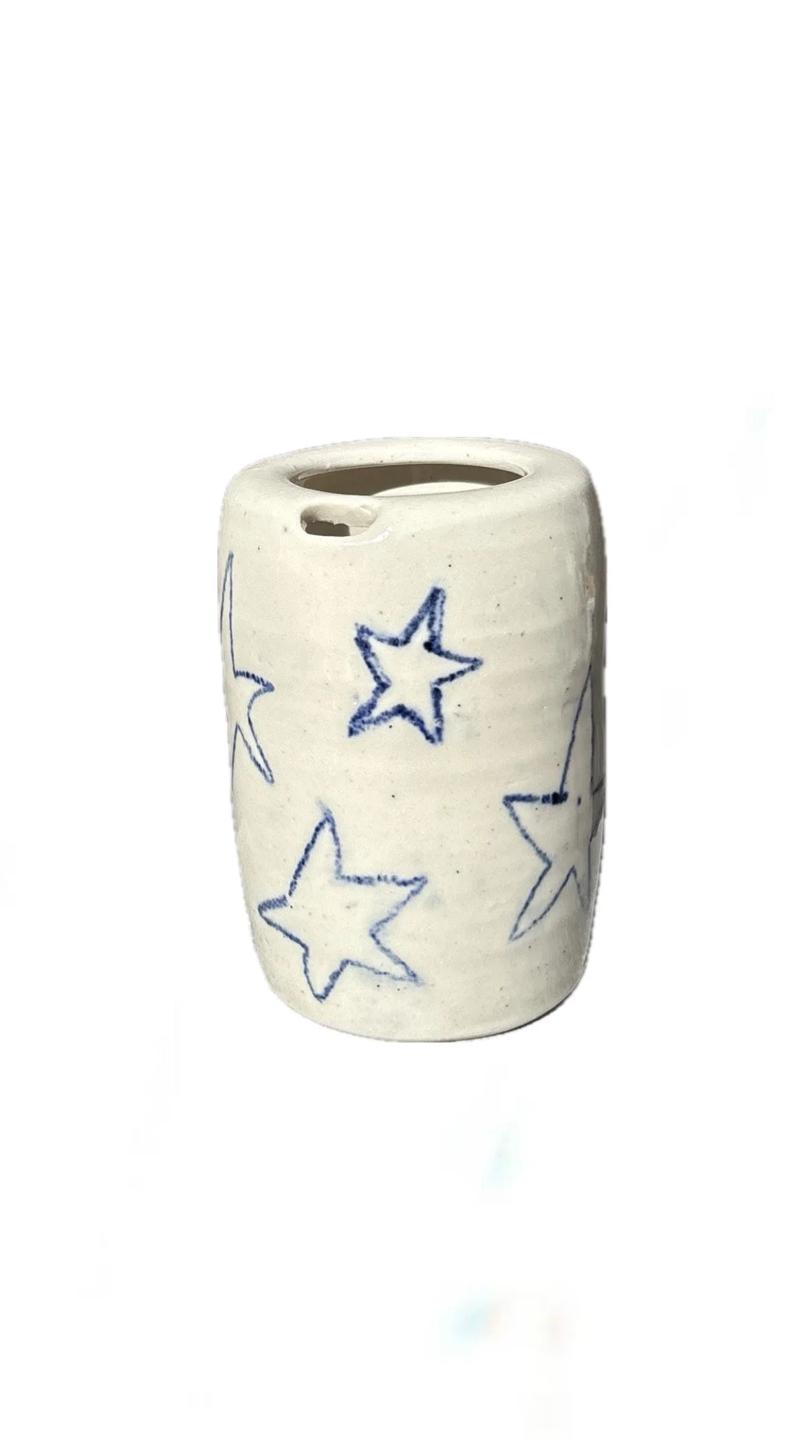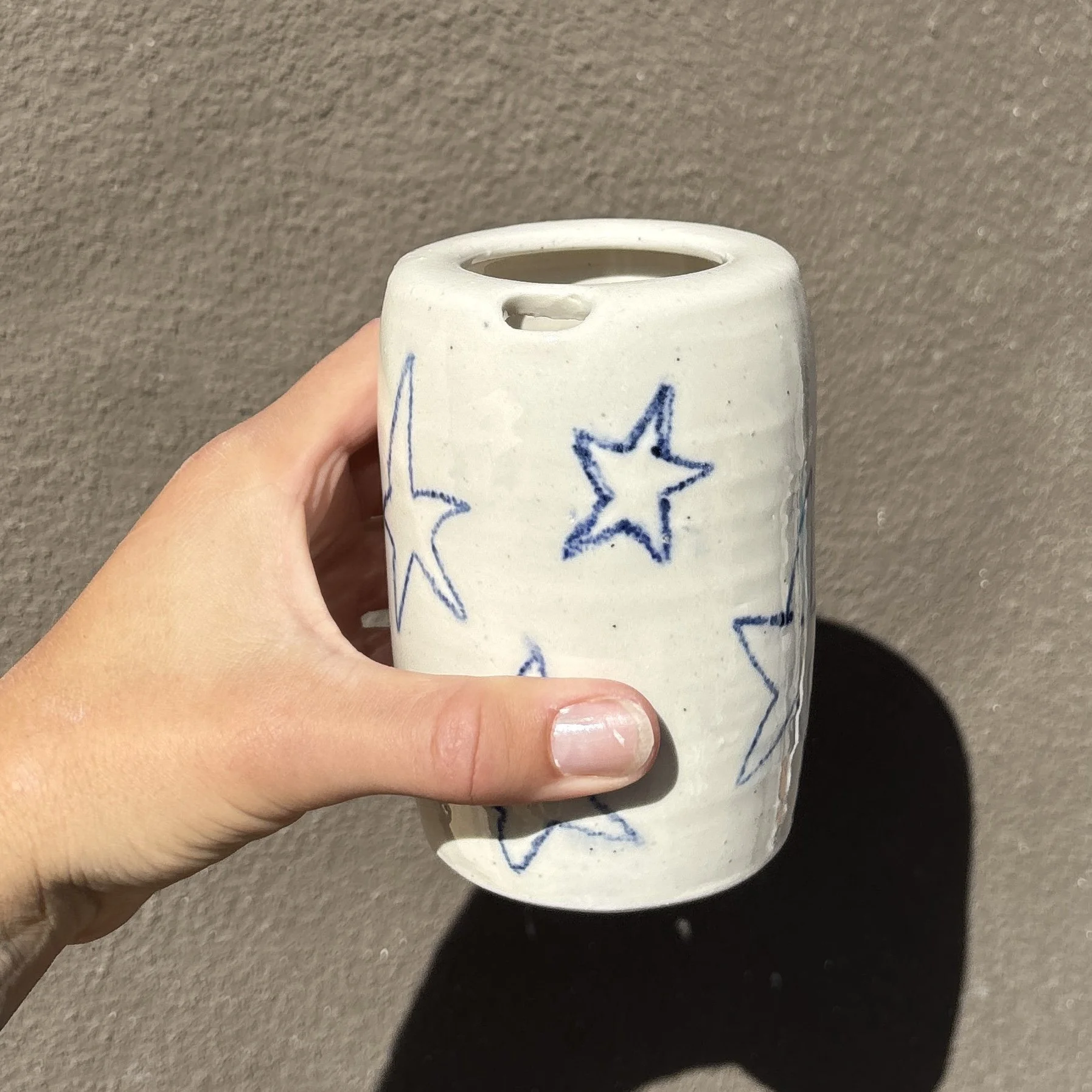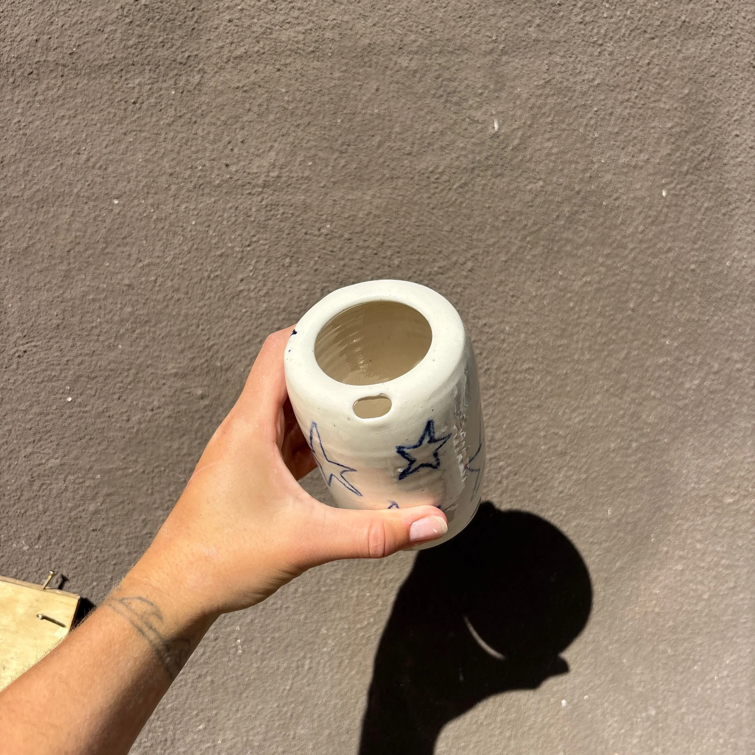 This handmade travel mug was carefully crafted and hand painted.